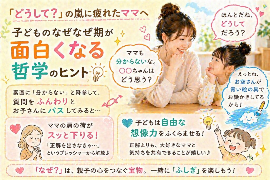 それは、親子で楽しむ立派な「哲学の時間」です。 次に「どうしてどうして」の嵐がやってきて途方に暮れてしまったら、どうぞ笑顔で「ママも分からない!」と言ってみてください。