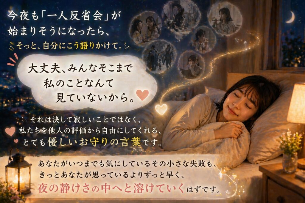 もし今夜も、布団の中で小さな失敗を責める「一人反省会」が始まりそうになったら。 そっと、ご自身にこう語りかけてみてください。
