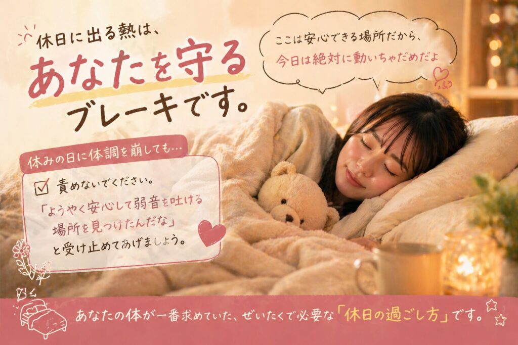 休日に出る熱は、あなたの体が「ここはもう安心できる場所だから、今日は絶対に動いちゃだめだよ」と、あなたを守るために力一杯踏んでくれたブレーキなのです。