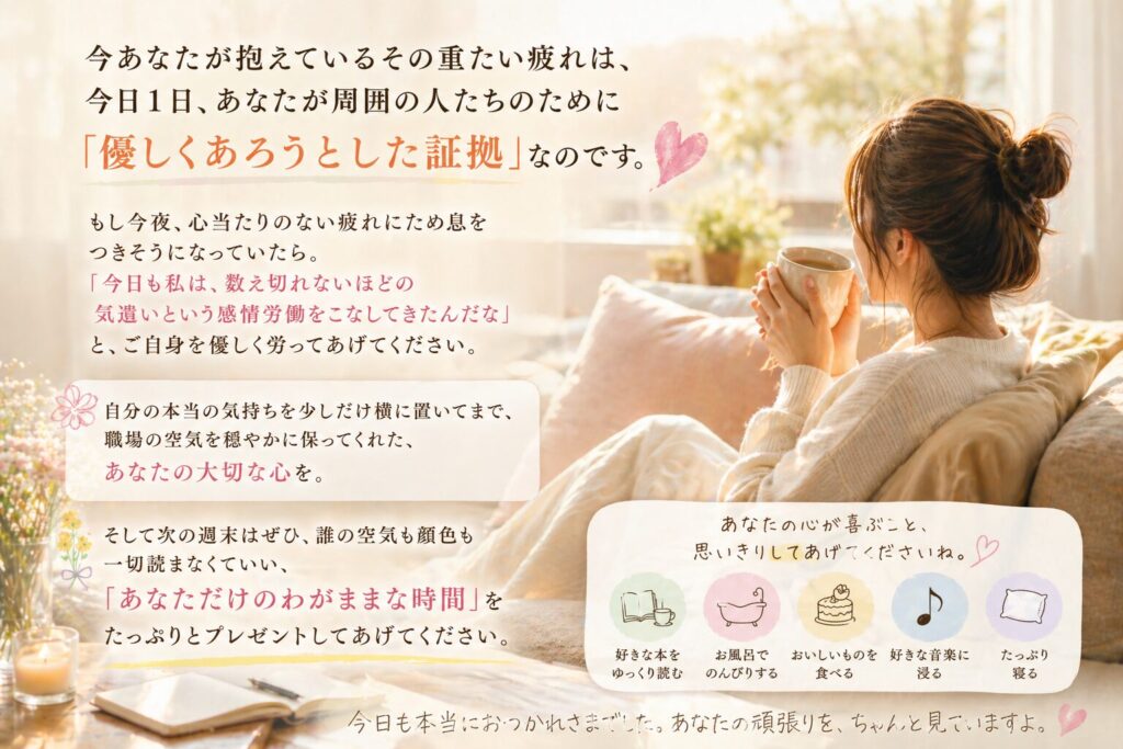 「今日も私は、数え切れないほどの気遣いという感情労働をこなしてきたんだな」と、ご自身を優しく労ってあげてください。
